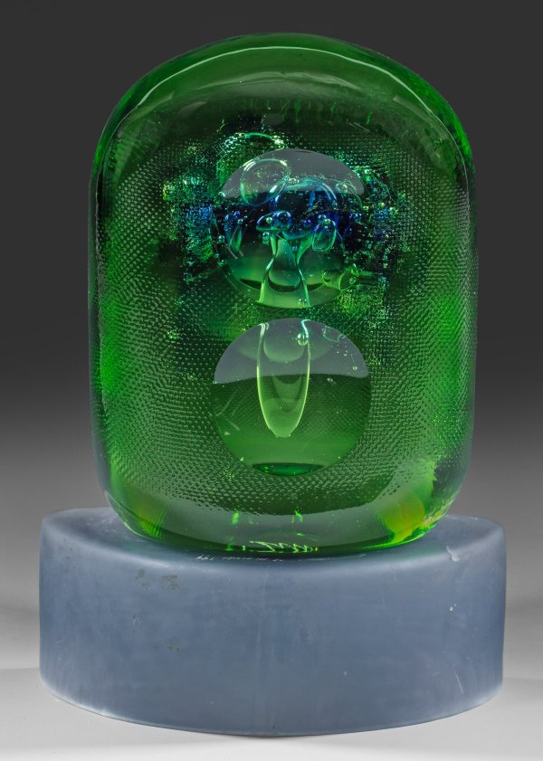 Skulpturales Objekt aus dickem, grünem Glas, blau marmorierte Einschmelzungen und unterschiedlich große Luftblasen, die Seiten mit feinem Gitter-Reiskornmuster, auf den breiten Seiten Schliffkugeln. Entw. Vladimír Jelínek für Moser, Karlsbad, um 1969/70, sign. "V. Jelinek"; die halbmondförmige Schale aus bläulich-violettem Glas mit gerader hochgezogener Wandung, undeutl. sign. u. dat. (19)94. H. 6,7 cm-18 cm.