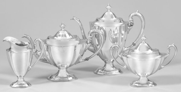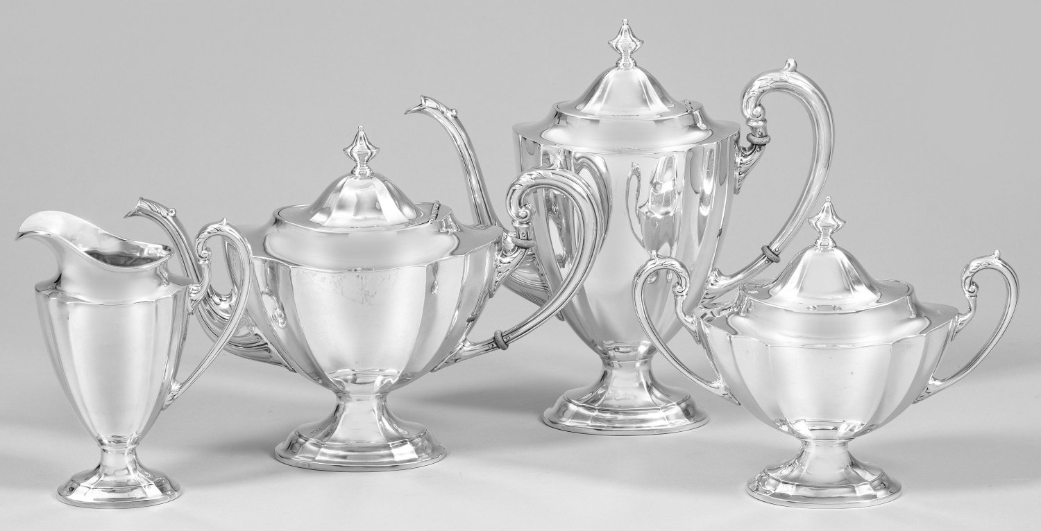 Sterlingsilber. 4-tlg.; Teekanne, Kaffeekanne, Zuckerdose, Sahnegießer. Ovaler, eingezogener Stand, übergehend in sich erweiternden Korpus mit abgesetzter, glatter Schulter. Korpus durch breite, vertikale Züge gegliedert. Bombierter Scharnierdeckel mit Balusterknauf. Tief angesetzter, konischer Ausguss und Ohrenhenkel verziert mit reliefiertem Akanthusblattdekor. Gest. Sterling, Herstellerzeichen Modell " WC512". Gew. zus. ca. 2180 g. H. 17,5 cm - 25,5 cm.