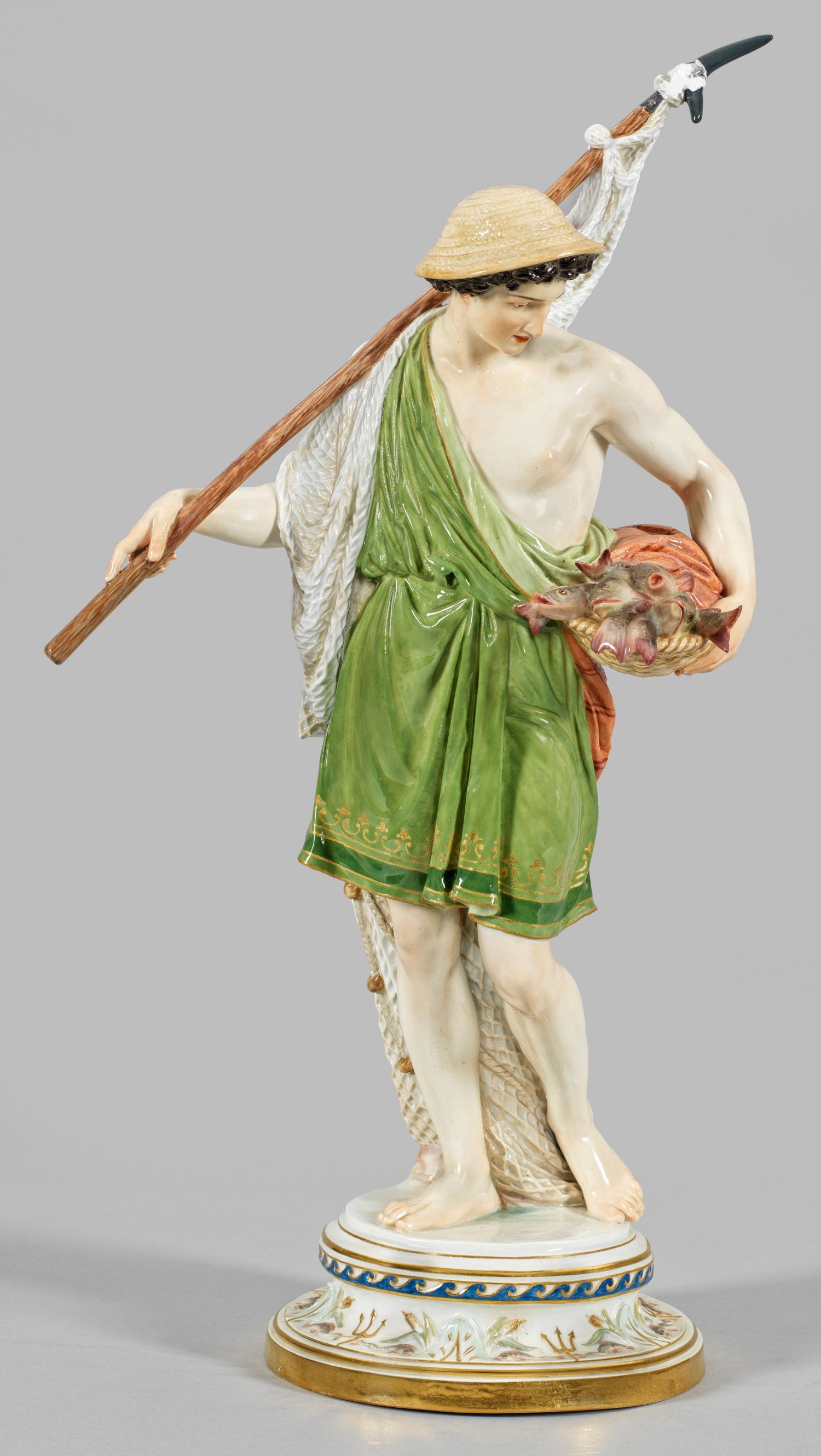 Profilierter Rundsockel mit reliefiertem Fries aus Schilfpflanzen, Delphin-, Dreizack- und Wellenmotiven. Stehender Fischer in antikisierendem, grünfarbenem, goldbordiertem Chiton und Strohhut, die geschulterte Harpune mit hängendem Fischernetz in der rechten Hand haltend. Den Blick auf einen Korb mit gefangenen Fischen in seiner linken Hand richtend. Polychrome Malerei mit Goldstaffage. Entw. Hermann Hultzsch, um 1882 - 1885. Modell-Nr. N 146. Besch.; Unw. rest.; Schwertermarke. H. 43,5 cm.