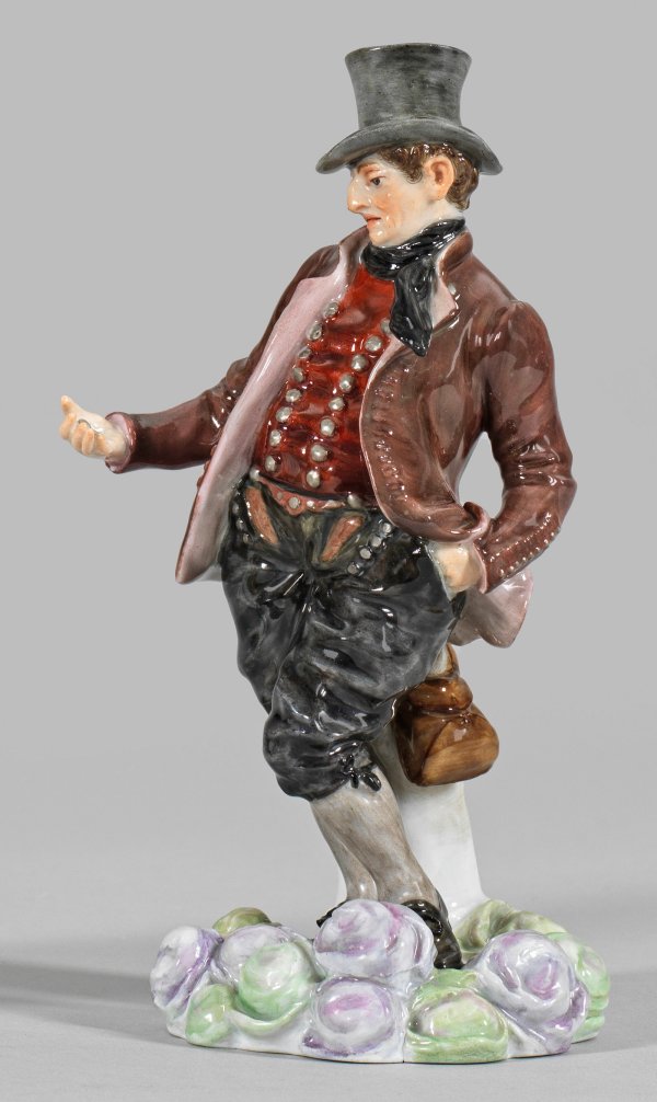 Runder, reliefierter Pflasterterrain-Sockel, belegt mit plastischen Kohlköpfen. An einem Grenzstein mit Hamburger Wappenschild stehender Bauer in traditioneller Tracht der Vierlande (Hamburg) mit Pumphose, kurzer Jacke und Silberknöpfen, die in seiner ausgestreckten rechten Hand liegenden Gold- und Silbermünzen betrachtend. Die Linke steckt in der Hosentasche. Polychrome Malerei mit Platinstaffage. Entw. Hugo Spieler, um 1897/98. Modell-Nr. Q 190 r. Kleine Brandrisse. Schwertermarke. H. 17 cm.