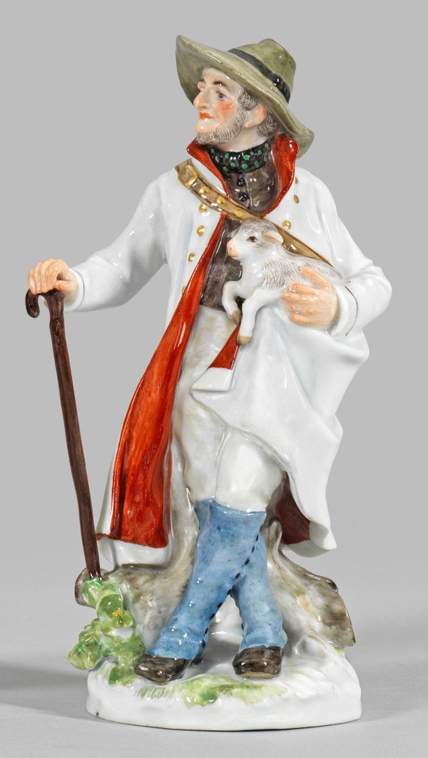 Auf naturalistischem Rundsockel stehender Schäfer in traditioneller Kleidung. Im linken Arm ein Zicklein haltend und sich mit der rechten Hand auf einen Stock abstützend. Polychrome Malerei mit Goldstaffage. Entw. Hugo Spieler, um 1897/98. Modell-Nr. Q 190 o. Rest.; Schwertermarke. H. 16 cm.