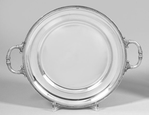 Silber. Runde Form mit glattem Spiegel, übergehend in gering gemuldete, ansteigende Fahne. Der Rand umzogen von stilisiertem Lorbeerblatt- und Stabfries. Seitlich zwei gebogte, mehrfach profilierte Griffe, die Enden in Akanthusblatt auslaufend. Gest. 800, Beschauzeichen mit Herstellernummer "76". Gew. ca. 935 g. Platten-D. 33 cm.