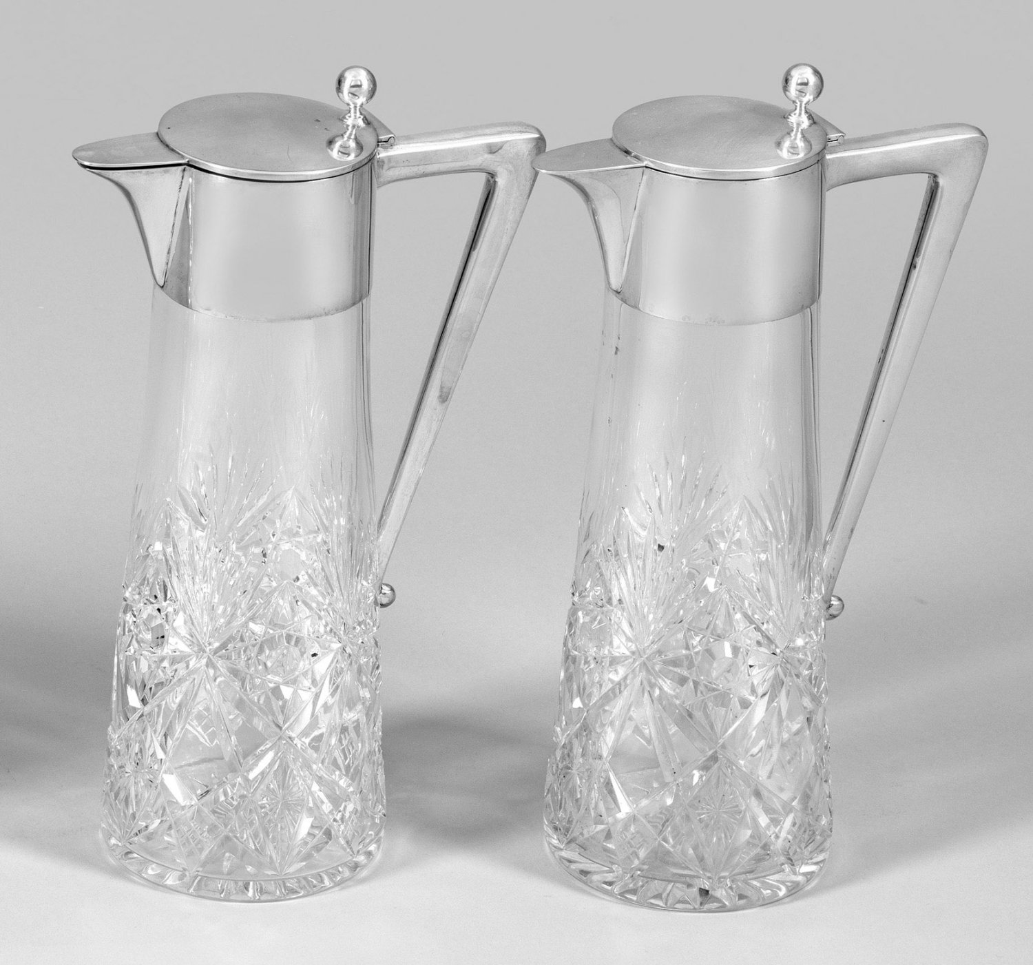 A pair of classic elegant German silver mounted cut glass carafes. Standard mark 800, maker´s mark.