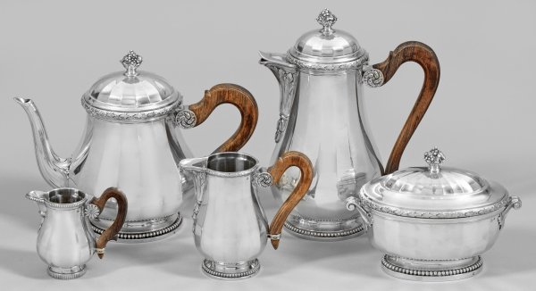 An exquisite and comprehensive French five-piece silver coffee and tea service with wooden handles. Assay and maker´s mark.