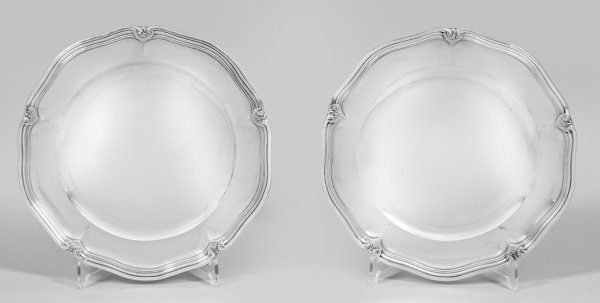 A pair of quality French silver dinner plates. Standard mark 950, french export mark since 1879 and maker´s mark.