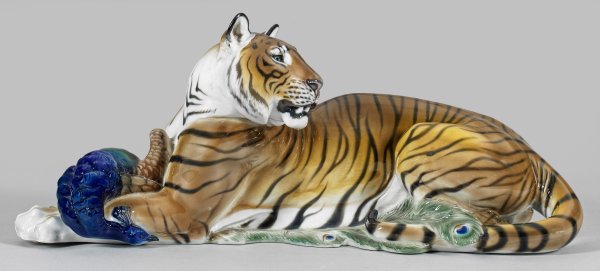 Am Boden liegendes Raubtier, den Kopf nach links rückwärts gewandt. Zwischen den Pranken ein liegender, erlegter Pfau. Naturalistische, polychrome Unterglasurmalerei. Entw. Theodor Kärner, 1925. Entw.-Bez.; Modell-Nr. 207. Manufakturmarke. H. 19,5 cm. L. 48 cm.