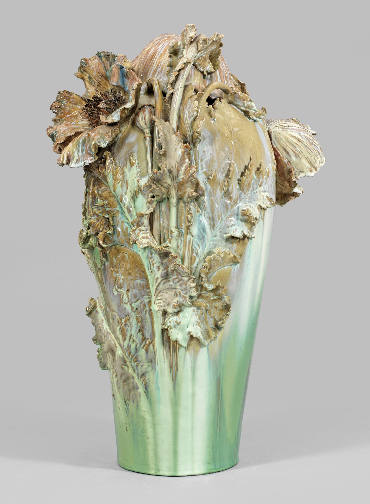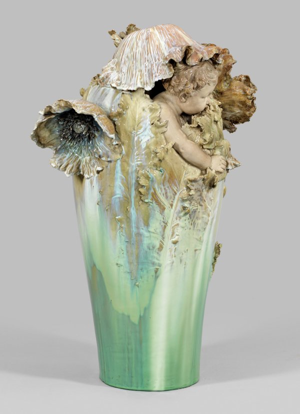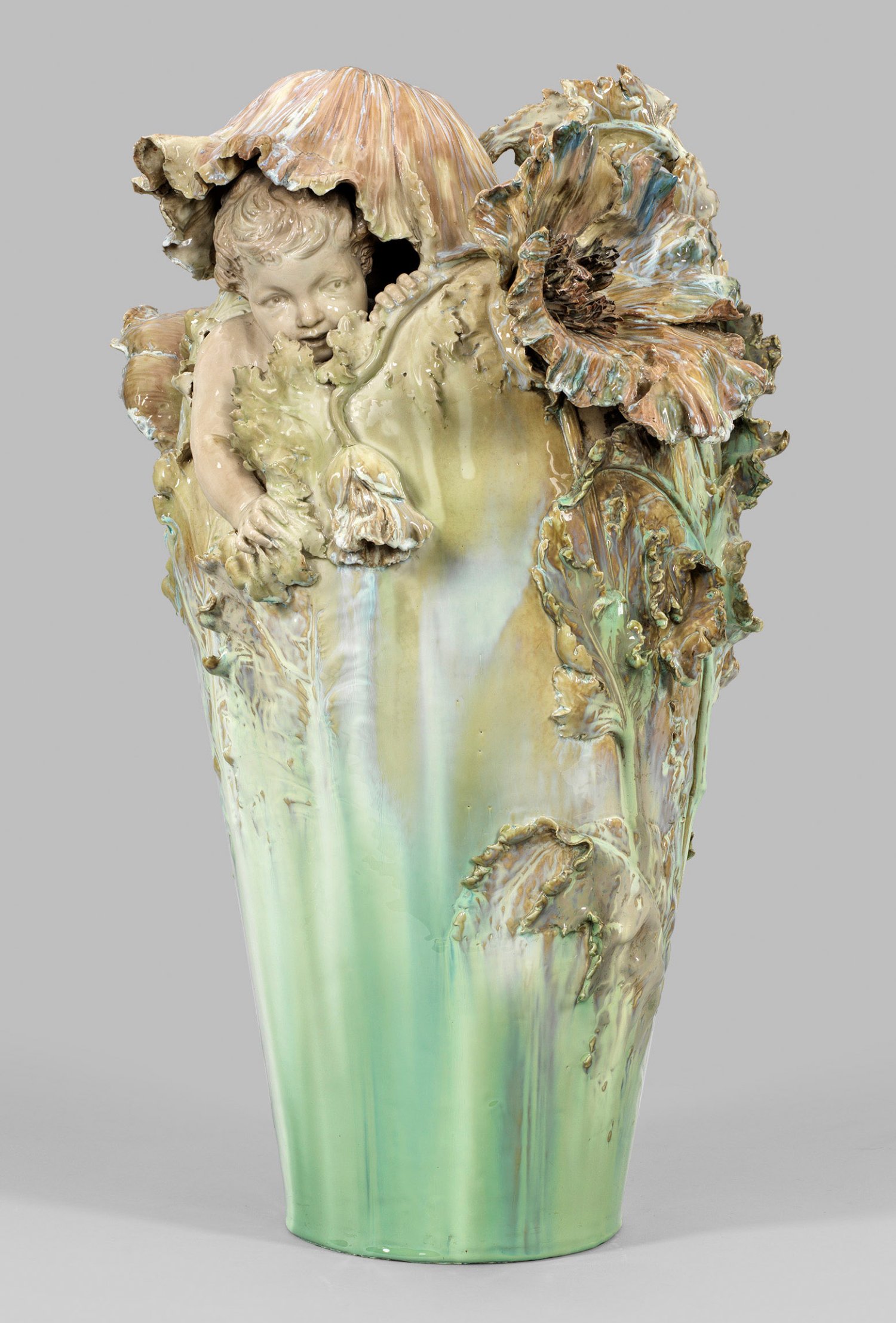 Porzellan mit allseitig in Mint- bis Türkisgrün- sowie Hellbraun changierender Laufglasur. Über glattem Rundstand mit kreisrundem Bodenloch keulenförmiger, sich erweiternder Korpus. Ausgehend von der unteren, glatten Wandung aufsteigender, flach bis stark reliefplastisch gearbeiteter, vegetabiler Dekor aus Stängeln und Blattstrukturen des Mohns, übergehend in freiplastische Blätter und große Mohnblüten. Seitlich, unter einem gesenkten, haubenförmig umgestülpten Kelchblatt hervortretender Kopf eines neugierig beobachtenden Kindes mit vollplastisch gearbeiteter Schulter, rechtem Arm und Händen, mit denen es sich am Blattwerk festhält. Modell-Entw. Richard Edmund Flöricke (tätig 1892 - 1942 in der KPM). Dekor-Entw. wohl Carl-Hans Bernewitz oder Franz Metzner. Modell-Nr. 6244 (Modellbucheintrag September 1899, bez. "Fische" (wohl irrtümlich für Modell-Nr. 6224 "Vase mit Fantasie Fischen"). Massebezeichnung Q XIII. Ein Stengel rep.; Verschwommene Zeptermarke. H. 73 cm.
