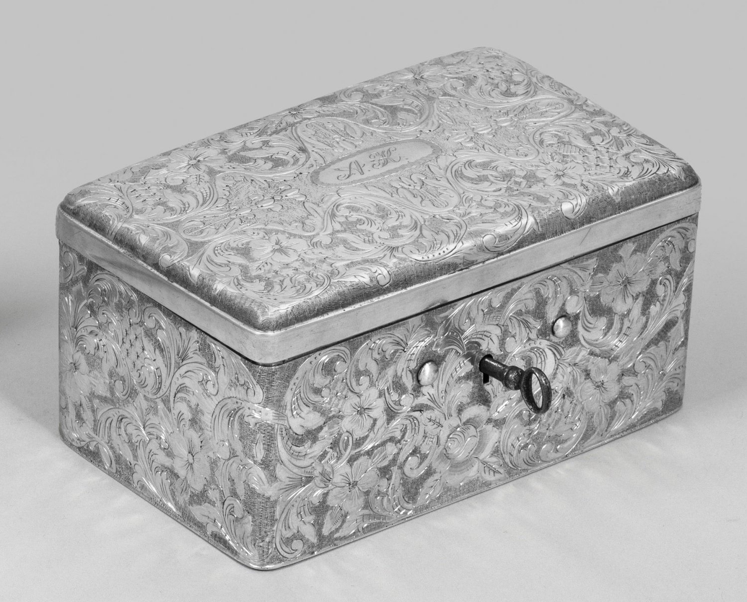 Silber. Rechteckige Form mit gerundeten Ecken und flachem, scharniertem Deckel. Wandung und Deckel flächendeckend verziert mit äußerst feinen und üppig gravierten, reliefierten Akanthusblattranken, Blüten und Blütenkelchen, Voluten und Gitterwerk über punziertem Grund. Zentral auf dem Deckel eine querovale, am Rand zart ziselierte Kartusche mit Monogramm "A.K.". Schauseitiges Schlüsselloch mit Kastenschloss und Schlüssel. Unbekannt gest.; Gew. ca. 410 g. H. 7 cm. 14 cm x 8 cm.