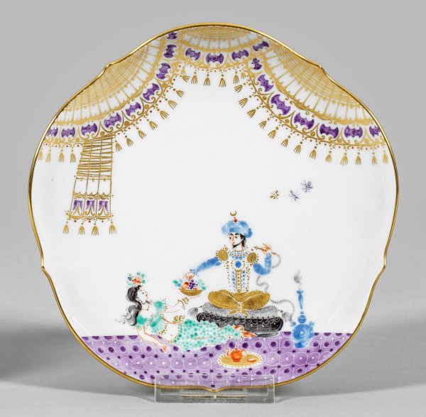Form "Großer Ausschnitt". Rund mit passig geschweiftem Rand. Im leicht vertieften Spiegel, unterhalb eines Goldvorhanges szenische Darstellung eines Liebespaares mit Früchteschale aus "1001 Nacht". Polychrome Malerei mit reichem Golddekor. Form-Entw. Ludwig Zepner. Dekor-Entw. Prof. Heinz Werner. Außenwandung vergoldet. Schwertermarke. D. 18,5 cm.