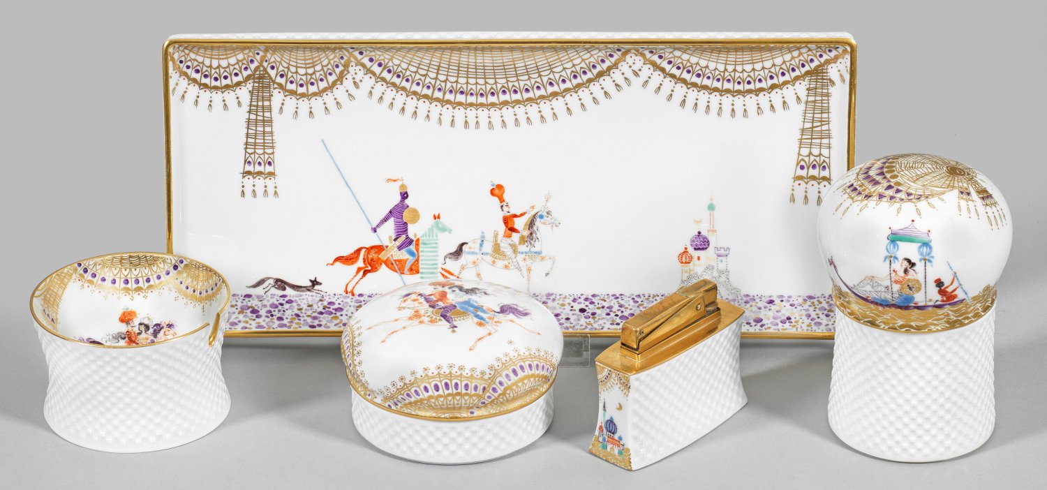 5-tlg.; Aschenbecher, Feuerzeug, 2 Deckeldosen und Tablett. Korpuswandungen mit sog. "Kästchenrelief". Auf der Wandung und im Spiegel, unterhalb eines Goldvorhanges szenische Darstellungen aus "1001 Nacht". Feine, polychrome Malerei. Goldrand. Form-Entw. Ludwig Zepner. Dekor-Entw. Prof. Heinz Werner. Tablett mit leicht abweichendem Relief. Schwertermarke. H. 5 cm - 6 cm. Tablett 30,5 cm x 13,5 cm.