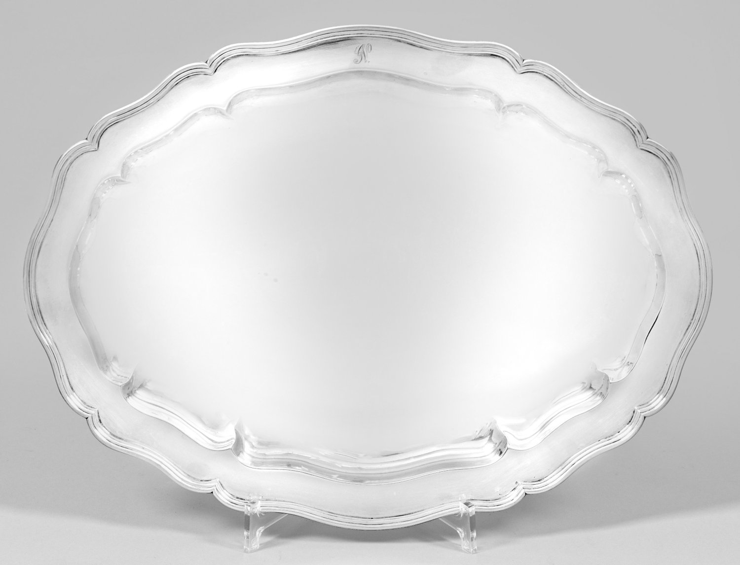 Silber. Oval, in klassischer Chippendaleform. Gering gemuldeter, glatter Spiegel, übergehend in leicht ansteigende Fahne und blütenförmig geschweiften, mehrfach profilierten Rand. Auf der Fahne graviertes und ligiertes Monogramm "GN". Gest. 12 Lot. Gew. ca. 975 g. 40,5 cm x 30 cm.