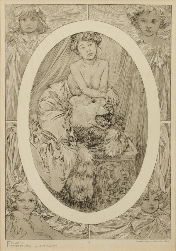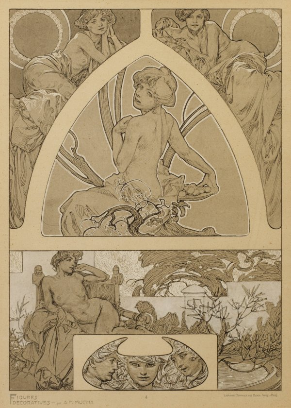 Lithographien/Papier, 1905. Jeweils unterhalb im Stein bez.; Blatt 2, 4, 9, 28 aus der berühmten Sammlung von 40 Blättern, die 1905 von der Librairie centrale des Beaux-Arts in Paris herausgegeben wurden. Als wegweisendes Werk der Jugendstil-Bewegung spiegelt es zugleich als Essenz Muchas künstlerisches Schaffen von 1895-1905 wider, dem Jahrzehnt, das ihn berühmt machte. Darstellung ca. 37 cm x 26,5 cm. Rahmen.