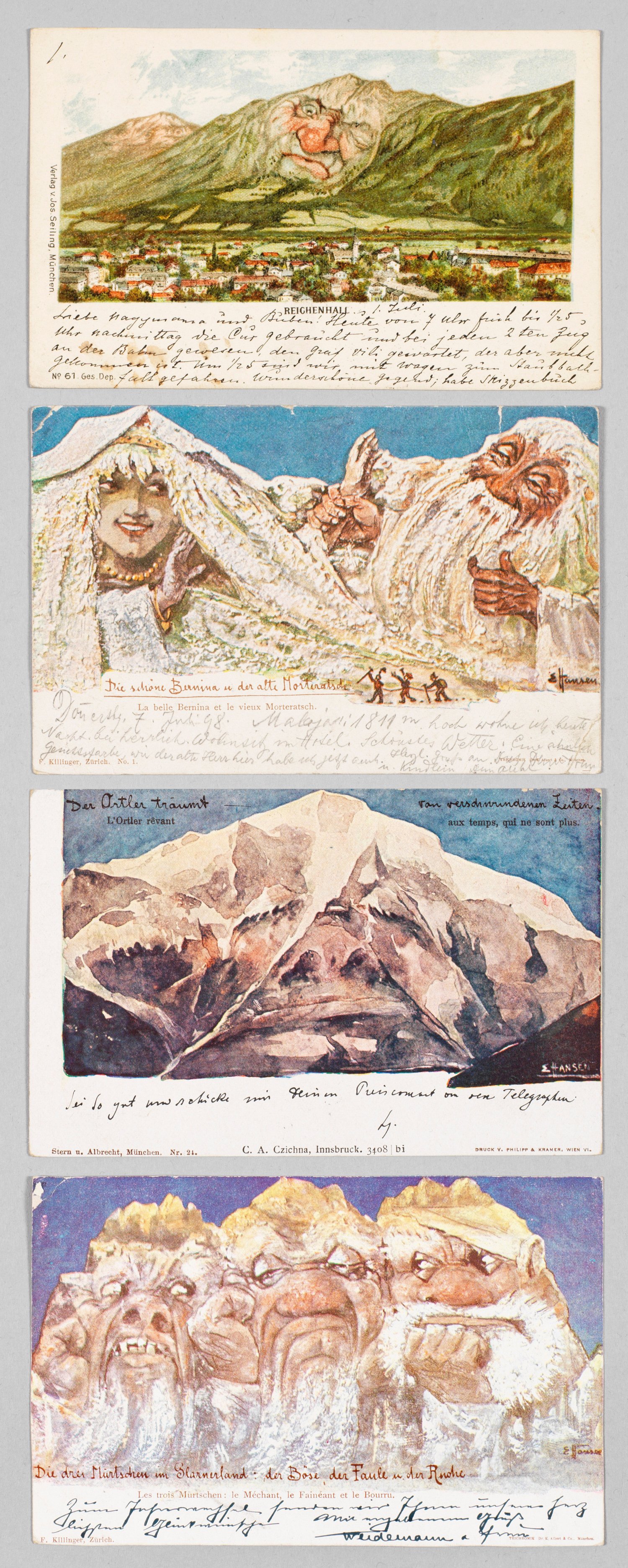 Chromolithographien/Postkartenkarton, 1896-1898. Im Druck sign. "E Hansen". Gelaufen, beschrieben, mit Poststempeln 1898 und 1899. Darunter "Der Ortler träumt von verschwundenen Zeiten", "Die schöne Bernina und der alte Morteratsch" und "Die drei Mürtschen im Glarner Land (...)". Nolde schuf seit 1894 in seiner St. Gallener Zeit unter seinem Geburtsnamen Hansen Aquarelle der Schweizer Berge, die er in märchenhafte Gestalten mit menschlichem Antlitz verwandelte. 1897 ließ er eine eigene, kommerziell höchst erfolgreiche Auflage der Bergpostkarten mit 30 Motiven drucken. Jeweils ca. 9 cm x 14 cm.
