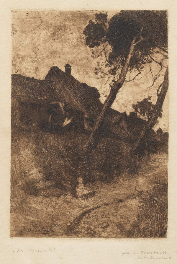 Radierung in Braun/Bütten, 1893. L. u. in der Platte sign.; R. u. stellvertretend vom Sohn des Künstlers sign. "für F. Overbeck F. Th. Overbeck" sowie betitelt. Zusätzliche Sign. vom Drucker Otto Felsing. Wvz. Werner 11. Darstellung 19,8 cm x 13,9 cm. Rahmen.