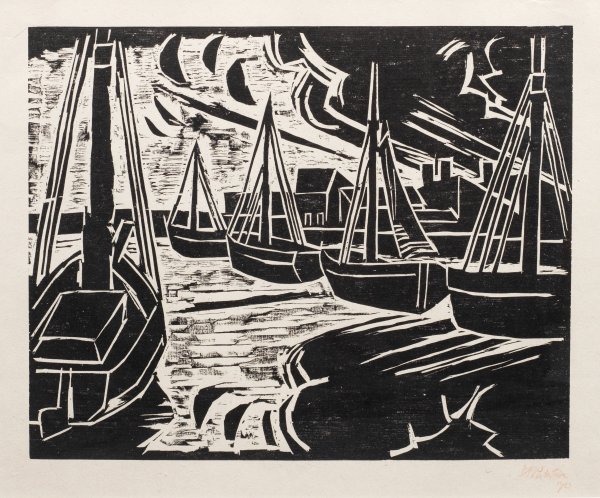 Holzschnitt/Papier. 1922. Mit rotem Farbstift (bzw. Rötel) sign. u. dat. 1923. Wvz. Krüger H 279. Laut Frau Julia Pechstein (der wir für freundliche Informationen danken) ist außer dem im Werkverzeichnis aufgeführten Exemplar nur dieses als zweites, neu bekanntes Exemplar dokumentiert. Das Blatt des bedeutenden Expressionisten, der 1906-1912 neben Erich Heckel, Karl Schmidt-Rottluff und Ernst-Ludwig Kirchner Mitglied der Künstlergemeinschaft "Brücke" war, entstand in einer Zeit persönlicher Umbrüche und Erfolge: 1921 lernte Pechstein das im heutigen Polen liegende Fischerdorf und den Badeort Leba in Pommern an der Ostseeküste kennen. Es wurde wie zuvor die Südsee und das litauische Nidden zu Pechsteins drittem Sehnsuchtsort, in den er bis 1945 immer wieder zurückkehrte. 1923 trennte sich Pechstein zudem von seiner ersten Frau und heiratete in Leba die von dort stammende Marta Möller. Im selben Jahr wählte ihn die Preußische Akademie der Künste in Berlin zum Mitglied und er erhielt eine nominelle Professur. Ger. Falten bzw. Stauchungen zu den oberen beiden Ecken im breiten Blattrand. Darstellung 40 cm x 49,5 cm. Rahmen.