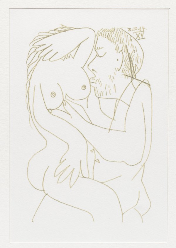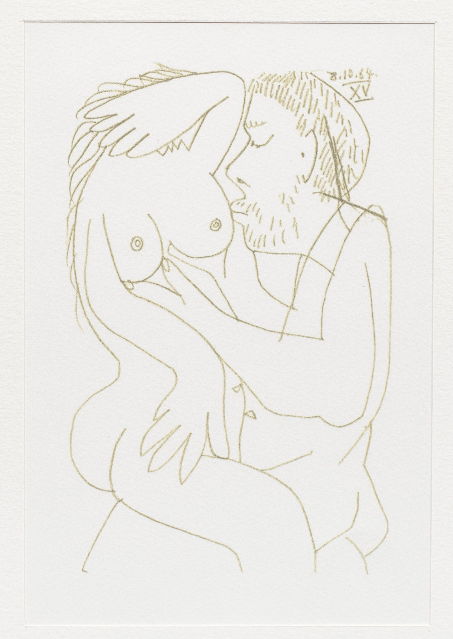 Lithographie/Velin, 1964/70. Im Stein dat. 8.10.64 XV. Aus der Mappe "Le Goût du Bonheur" mit 71 Lithographien nach Zeichnungen Picassos aus dem Jahr 1964, erschienen 1970 in drei Editionen (C. Schünemann, Bremen; Harry N. Abrams, New York; Cercle d'Art Paris) in einer Gesamtauflage von 1998 Exemplaren. Blatt 24 cm x 18 cm. Rahmen.