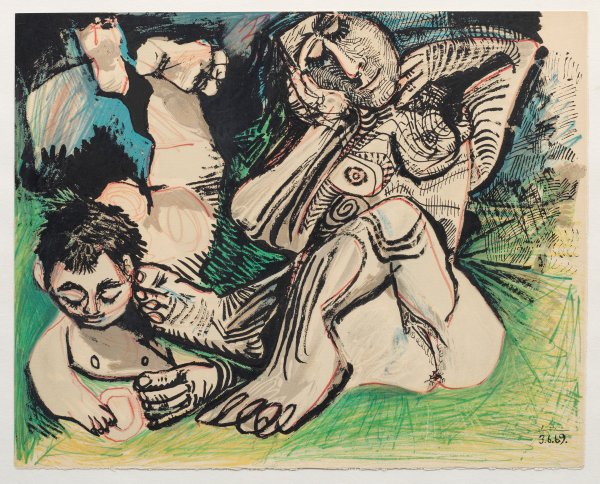 After Pablo Picasso (1883 - 1973). Lithograph in colours on wove paper, printed by Mourlot, Paris, in 1972. Dated "3.6.(19)69)" on the stone. After the well known coloured chalks and brush drawing by Picasso.