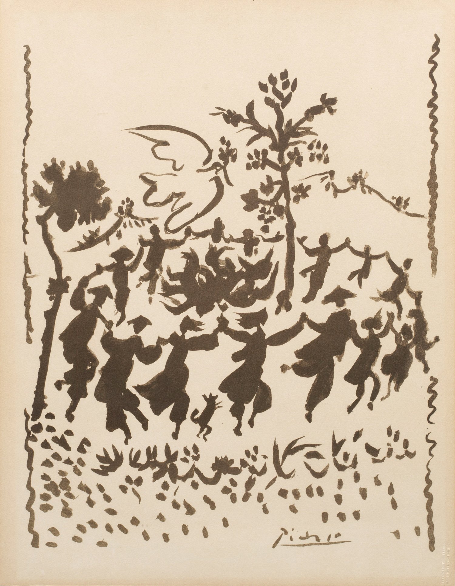 Lithographie/Arches-Velin. Im Stein sign.; Blindstempel des Hrsg. "EDITIONS COMBAT POUR LA PAIX (/) COPYRIGHT S. P. A. D. E. M. PARIS". Mit der auch unter dem Titel "Der Friedenskreis" bekannten Grafik nach der Tuschpinselzeichnung aus dem Jahr 1954 feierte Picasso das Ende des Indochinakrieges zwischen Frankreich und Vietnam. Gebräunt. Blatt ca. 64,5 cm x 50 cm. Rahmen.