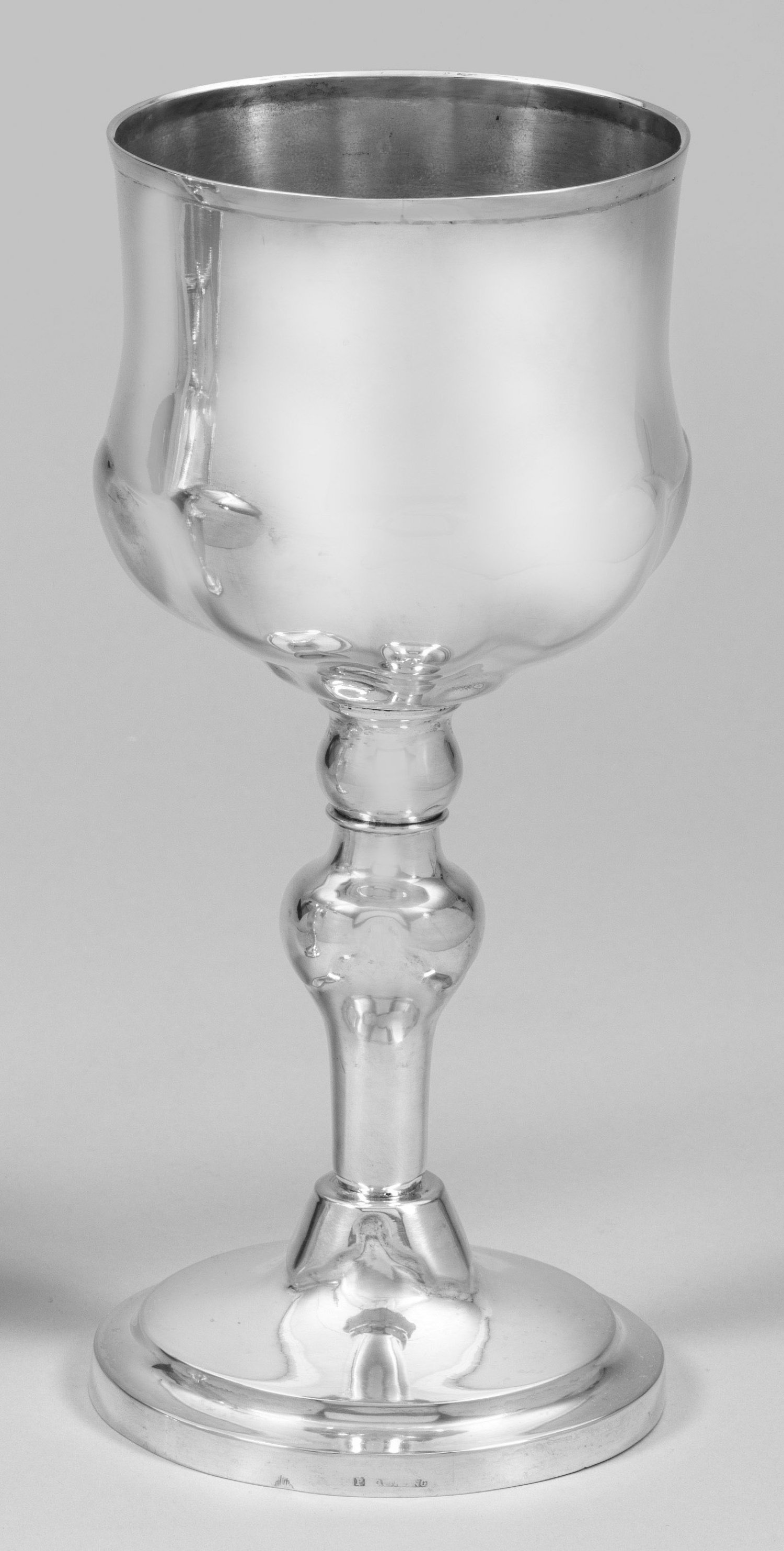 Silber. Gekehlter Rundfuß, übergehend in hohen Balusterschaft. Gering gebauchte, die untere Wandungshälfte von vertikalen, weichen Buckeln umzogene Kuppa mit zart abgesetzter Randzone. Gest., Beschauzeichen, Meister David Christian Quirling (tätig ab 1823). Gew. ca. 515 g. H. 27,5 cm.