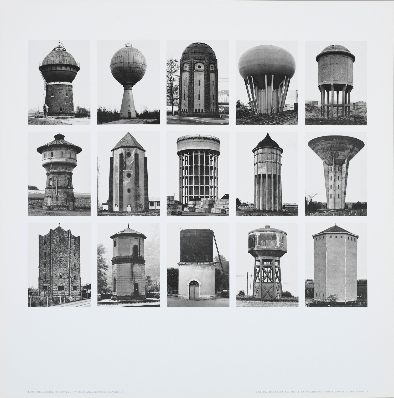 Offsets/festes, glattes Kunstdruckpapier. Unterhalb jeweils typographisch bez.; Hrsg. Achenbach + Costa Kunstverlag AG GmbH, 2005. Nach den Fotografieserien "Wassertürme" (1999, Kunstsammlung Nordrhein-Westfalen). "Förderturmköpfe" und "Fachwerkhäuser" (2003, Museum für Gegenwartskunst Siegen). Ein Blatt im breiten Rand mit ger. Läsur. Blatt jeweils ca. 70 cm x 70 cm.