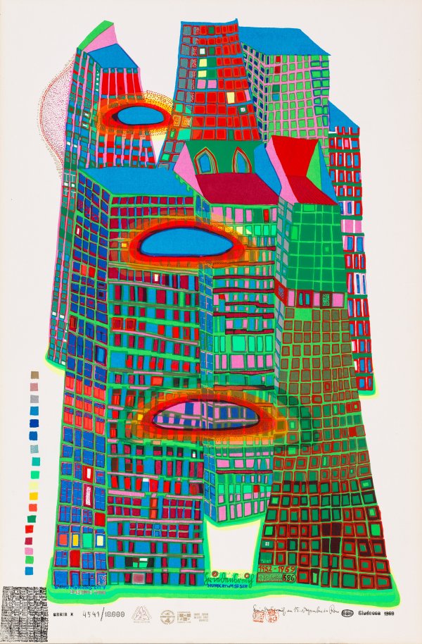 Farbserigraphie mit Metallfolienprägung/CM Fabriano-Velinkarton, 1969. Sign. u. dat. "Friedensreich, am 15. Dezember in Rom" sowie mit zwei roten, japanischen Inkan-Stempeln, nummeriert 4451/10000. Gedruckt bei Studio Quattro, Campalto-Venedig, verlegt von Dorothea Leonhardt München, unten mit deren vier silbernen Prägestempeln. Wvz. Koschatzky 41a (von b). Prachtvoller Druck in leuchtender Farbigkeit mit Rand. Darstellung ca. 76,5 cm x 47 cm; Blatt ca. 84,8 cm x 55,5 cm.
