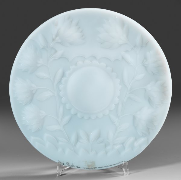 Flache Form. Weiß-bläuliches Opalglas, rück- bzw. unterseitig Standring/Aufhängung aus Metall. Reliefdekor aus Blumen und Sonne. Künstler-Bez. sowie Manufakturangabe mit Bez. u. Nummerierung "Ivan Rabuzin 3000/1646 Jahresteller 1978 Limitierte Kunstreihen". Selb. Rosenthal. 1978. D. 36 cm.