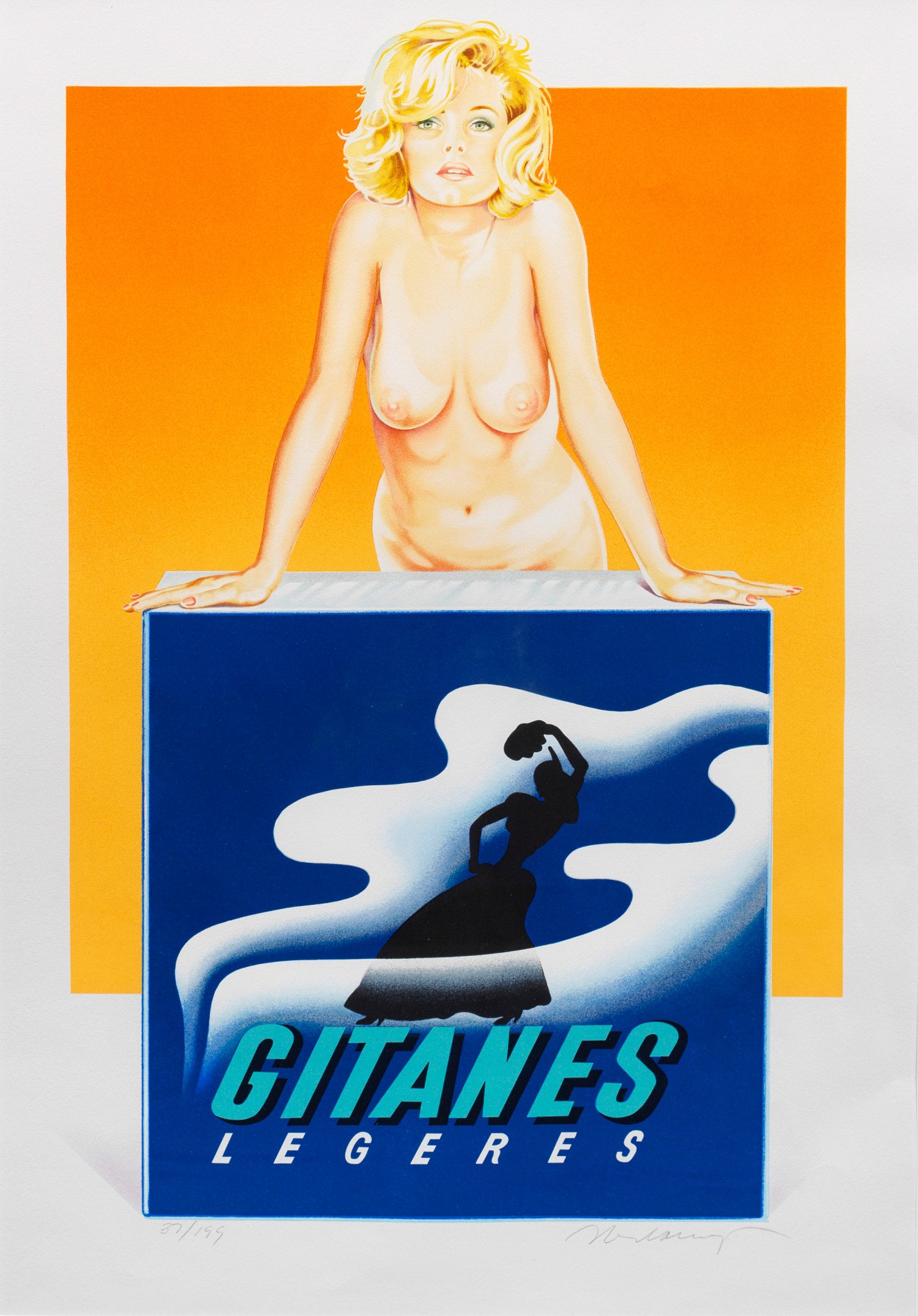 Farblithographie/Velin, 1999. Sign. u. nummeriert 37/199. Hrsg. Galerie Ernst Hilger, Wien. Wvz. Hilger GL 2-99. Wie häufig in seinen grafischen Arbeiten, kombiniert der amerikanische Pop-Art Künstler auch in "Gitanes" einen aufreizend erotischen, weiblichen Akt mit einem Produkt der Konsum-Kultur. 1961 begann Remos mit Comic-Figuren und wandte sich dann der Darstellung von Pin-Up-Girls mit eindeutigem Sex-Appeal als Verkaufs-Werbeträger zu, wobei die Produkte oft unverblümte Phallus-Symbole sind. Darstellung ca. 66,5 cm x 43 cm. Rahmen.