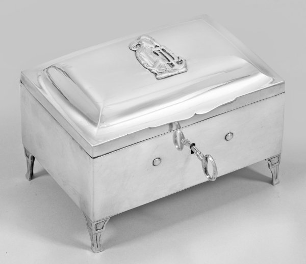 Silber. Von vier Füßen getragener, rechteckiger Korpus. Scharnierter, zur Mitte hin sanft ansteigender Deckel mit zentral applizierter, reliefplastisch dargestellter Frau in antikisiertem Gewand, sich auf einem Anker abstützend. Schmaler, zart geschweifter Drücker. Schauseitiges Schlüsselloch mit Schlüssel. Innen vergoldet. Gest., Tremolierstrich, Beschauzeichen, Meister Johann Carl Franz Sonnabendt (wird Meister 1815), preußischer Steuerstempel. Gew. ca. 520 g. H. 10 cm. 14,5 cm x 9,5 cm.