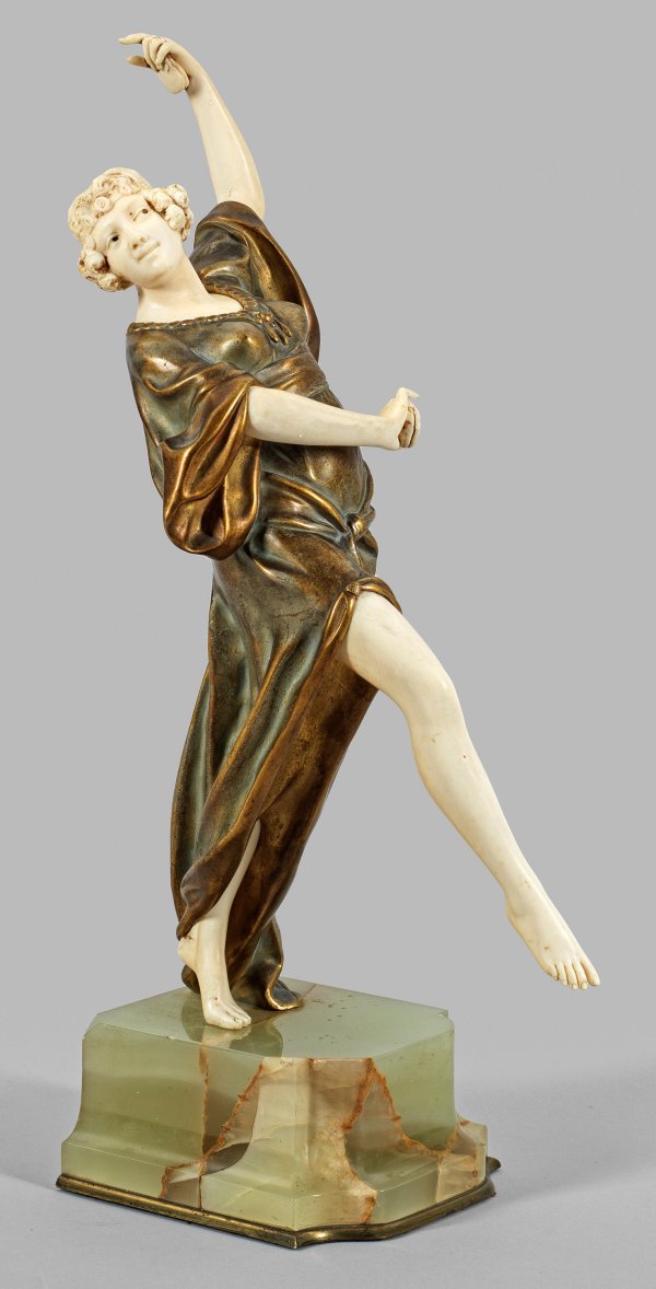 Chryselephantinfigur. Bronze, teilw. vergoldet, Elfenbein geschnitzt; Onyxsockel. Sign., an einem Saum nummeriert "3763" (Modell- oder Gießer-Nr.). Auf ihrer rechten Fußspitze in graziöser Pose stehende Tänzerin mit erhobenem rechten Bein und gegen den Uhrzeigersinn gehaltenen Armen. Rossi lernte in Neapel bei Achille d'Orsi (1845 - 1929), er selbst wurde rasch durch seine realistischen Darstellungen und später auch Jugendstil-Büsten und -Statuetten ein international bekannter Bildhauer. Schon 1891 beteiligte er sich an der Triennale in Mailand, 1894 wurde seine lebensgroße Bronze eines Fischerburschen mit Oktopus auf der Ausstellung "Segona Exposició General de Belles Arts" in Barcelona ausgezeichnet und vom Museum erworben, 1904 beschickte er auch die "Italian Exhibition" in Earls Court in London 1904. Ges.-H. 44 cm.