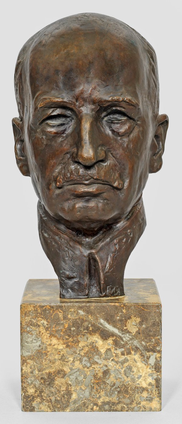 Bronze, dunkelbraun patiniert. Monogr. "FvG". Marmorsockel in unterschiedlichen Brauntönen, partiell hellgrau. Ausdrucksvoll charakterisierender Porträtkopf des umstrittenen, heute vor allem als Tierbildhauer bekannten Künstlers. Zu seinen bekannten Bildnissen zählen u. a. Porträts von Robert Bosch und Eugen Bolz. Bronze-H. 36,5 cm; Ges.-H. 50 cm.