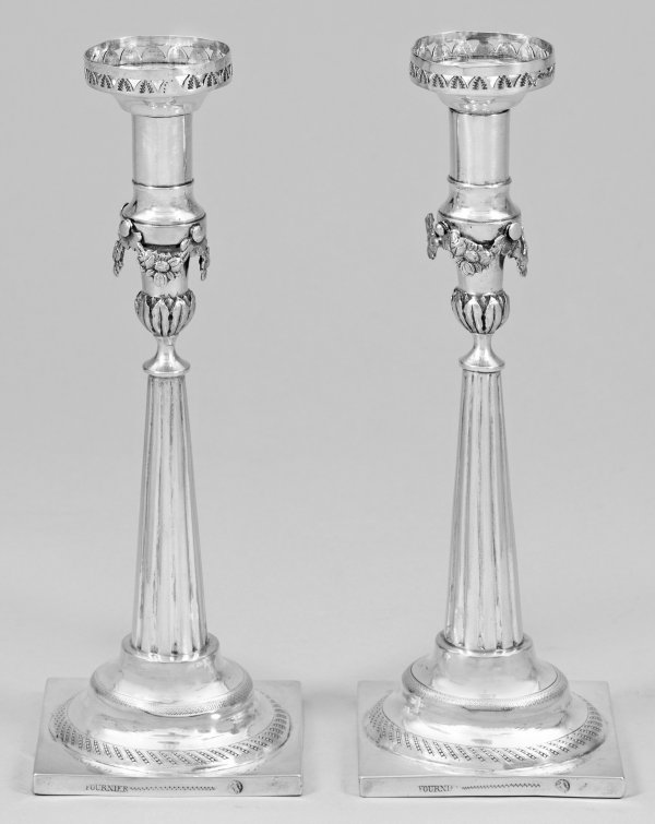 A pair of German Empire silver candlesticks by Leberecht Fournier (master since 1815). Minor damages. Test, assay and master´s mark.