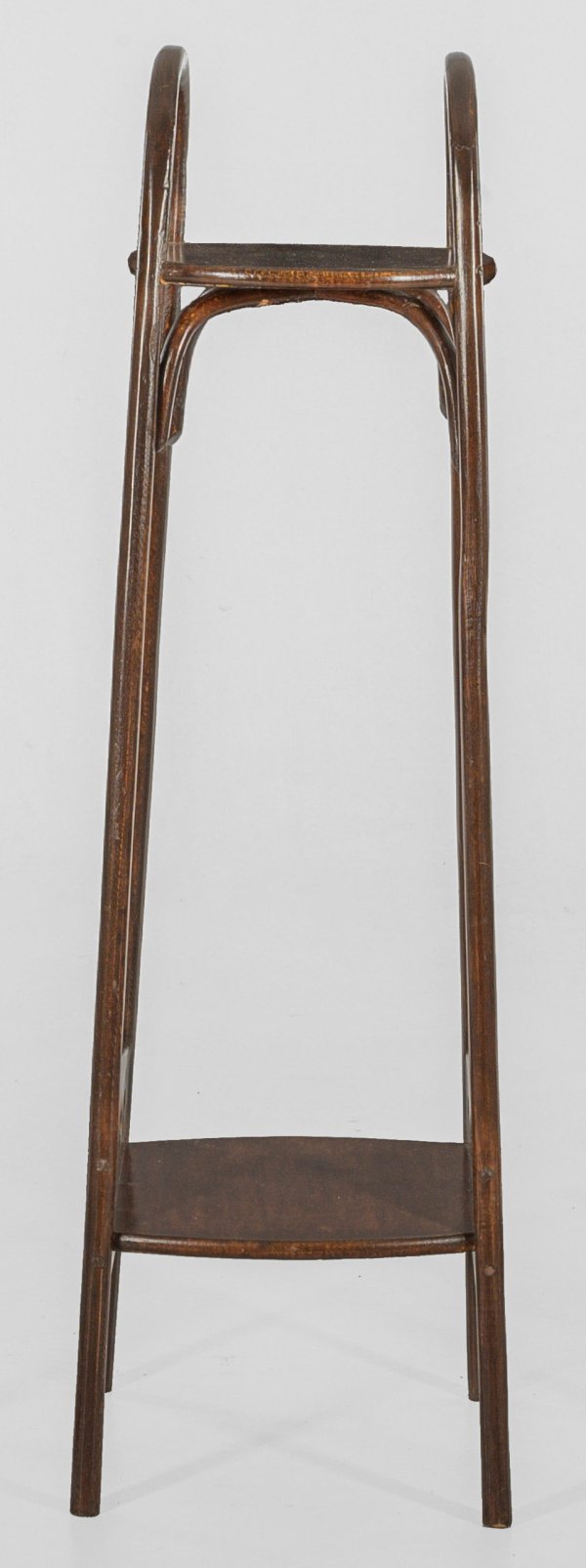 Buchenholz, mahagonifarben gebeizt. Gestell aus stark gebogten Rundstäben und gegeneinander gestellten Streben als Träger für gestaffelt angeordnete, gerundete Ablageflächen. Unbez; Entw. Josef Hoffmann, um 1904. H. 121 cm.
