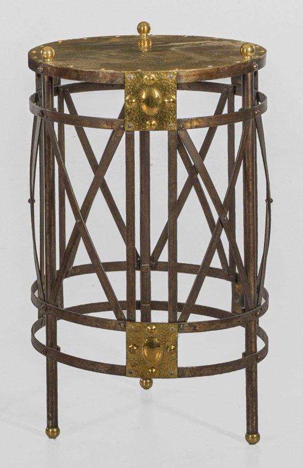 Eisen und Messing. Zylinderförmiger, offen gestalteter Korpus aus Rundstäben und teilw. kreuzförmig angeordneten Streben und Stegen. Rechteckige Reserven sowie runde Deckplatte mit flächendeckendem Hammerschlagdekor. Knaufbekrönungen. H. 73 cm. D. 43 cm.