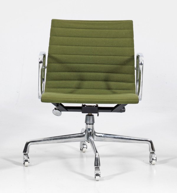 Modell EA 117. Aluminium, verchromt und grüner Stoff. Zylinderförmiger Schaft auf sog. Stern-Fuß mit Rollen als Träger für ehemals höhenverstellbare, flache Sitzfläche, in entsprechende Rückenlehne übergehend. Seitlich gebogte Armlehnen. Entw. Charles Eames, 1958. Sitz-H. 42 cm.