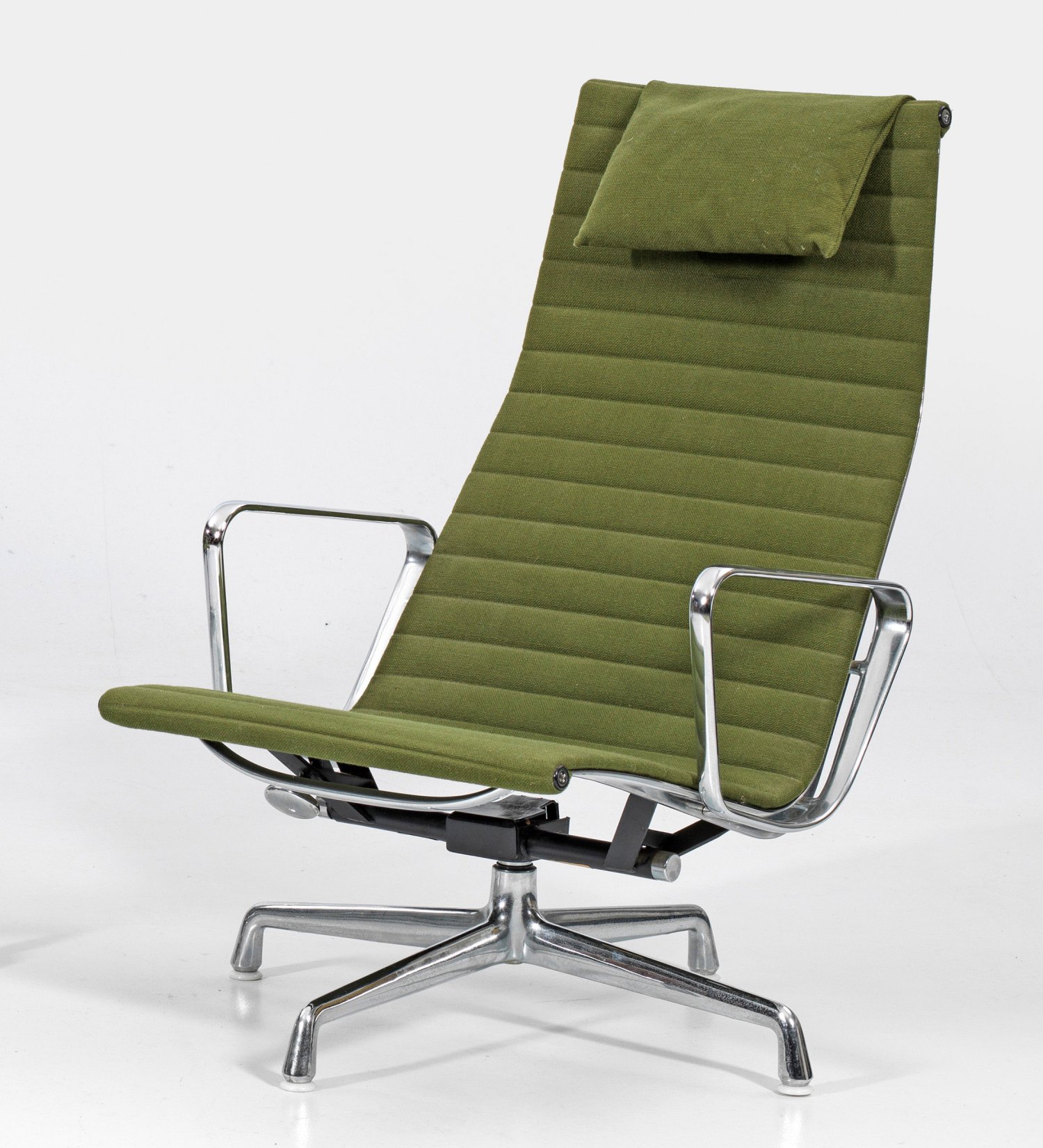 Modell EA 116. Aluminium, verchromt und grüner sog. Hopsak-Stoff. Zylinderförmiger Schaft auf sog. Stern-Fuß als Träger für flache Sitzfläche, in entsprechende, hohe Rückenlehne übergehend. Seitlich gebogte Armlehnen. Herstellerzeichen. Entw. Charles Eames, 1958. H. 97 cm. 65 cm x 68 cm. Sitz-H. 36 cm.