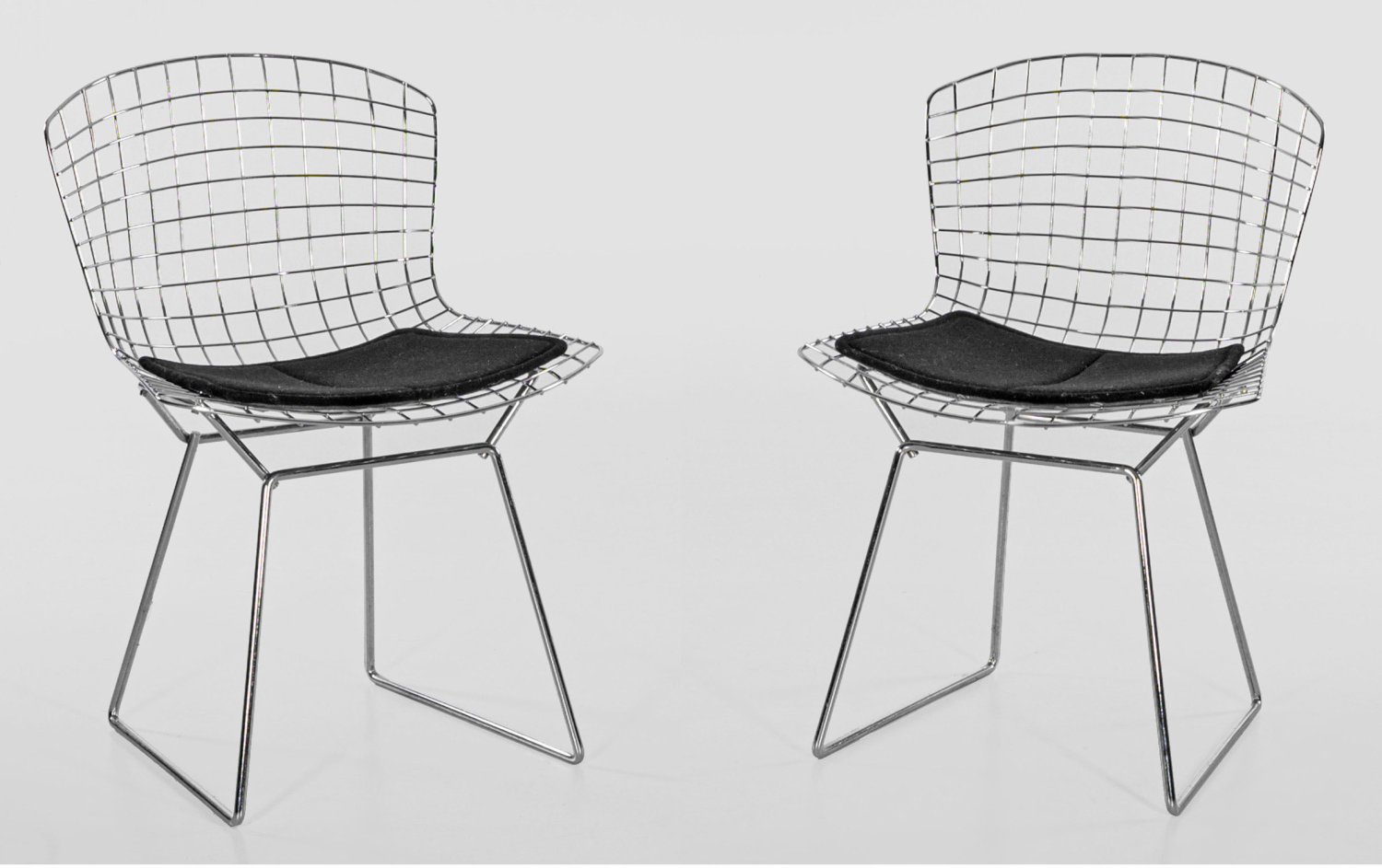 Modell 420. Rundstahl und Eisengitter, verchromt und schwarzer Stoff. Organisch geformte Sitzschalen aus Drahtgeflecht auf Gestell aus dünnen, gebogten Rundstäben. Polster mit Herstellerzeichen. Entw. Harry Bertoia, 1952. H. 78 cm. 54 cm x 48 cm. Sitz-H. 44 cm.