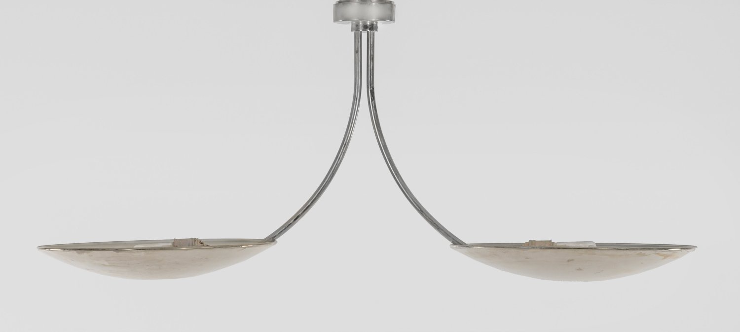 2-flg.; Messing, vernickelt und teilw. cremefarben lackiert. Schlanke, gebogte Rundstäbe als Träger für Leuchtmittel aus flach gewölbten Lampenschalen mit je einer Lampenfassung. Elektrifiziert. Entw. Florian Schulz. H. 45 cm. 110 cm x 40 cm.
