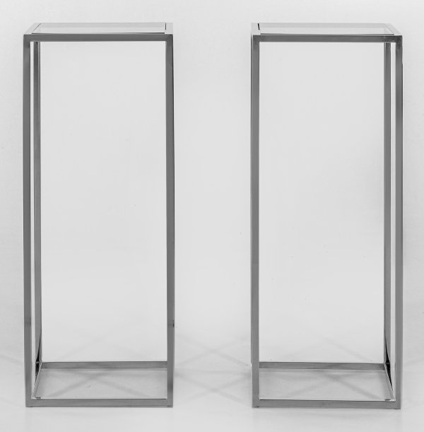 Metall, vernickelt und farbloses Glas. Hochrechteckiger Korpus aus gekanteten Stegen als Träger für eingelegte Deckplatte. H. 100 cm. 40 cm x 40 cm.