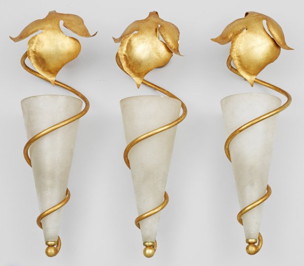 Three Italian gilt metal and Murano glass wall lamps.