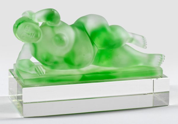 Die Skulptur aus farblosem, grün verlaufendem und in die Form geblasenen und satiniertem Glas mit einem liegenden Akt auf rechteckiger Plinthe; der Sockel aus massivem, farblosem, geschliffenem, poliertem Kristallglas. Ges.-H. 16,5 cm.