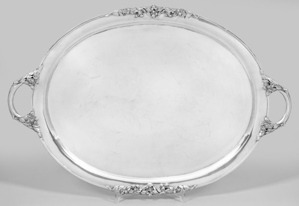Silber. Ovale Form. Glatter Spiegel, übergehend in gekehlt ansteigende, randprofilierte Fahne mit reliefplastischen, teilw. durchbrochen gearbeiteten, floralen Rosengebinden. Korrespondierend verzierte, seitliche Griffe. Gest. 800, Herstellerzeichen. Gew. ca. 2120 g. 62 cm x 42 cm.