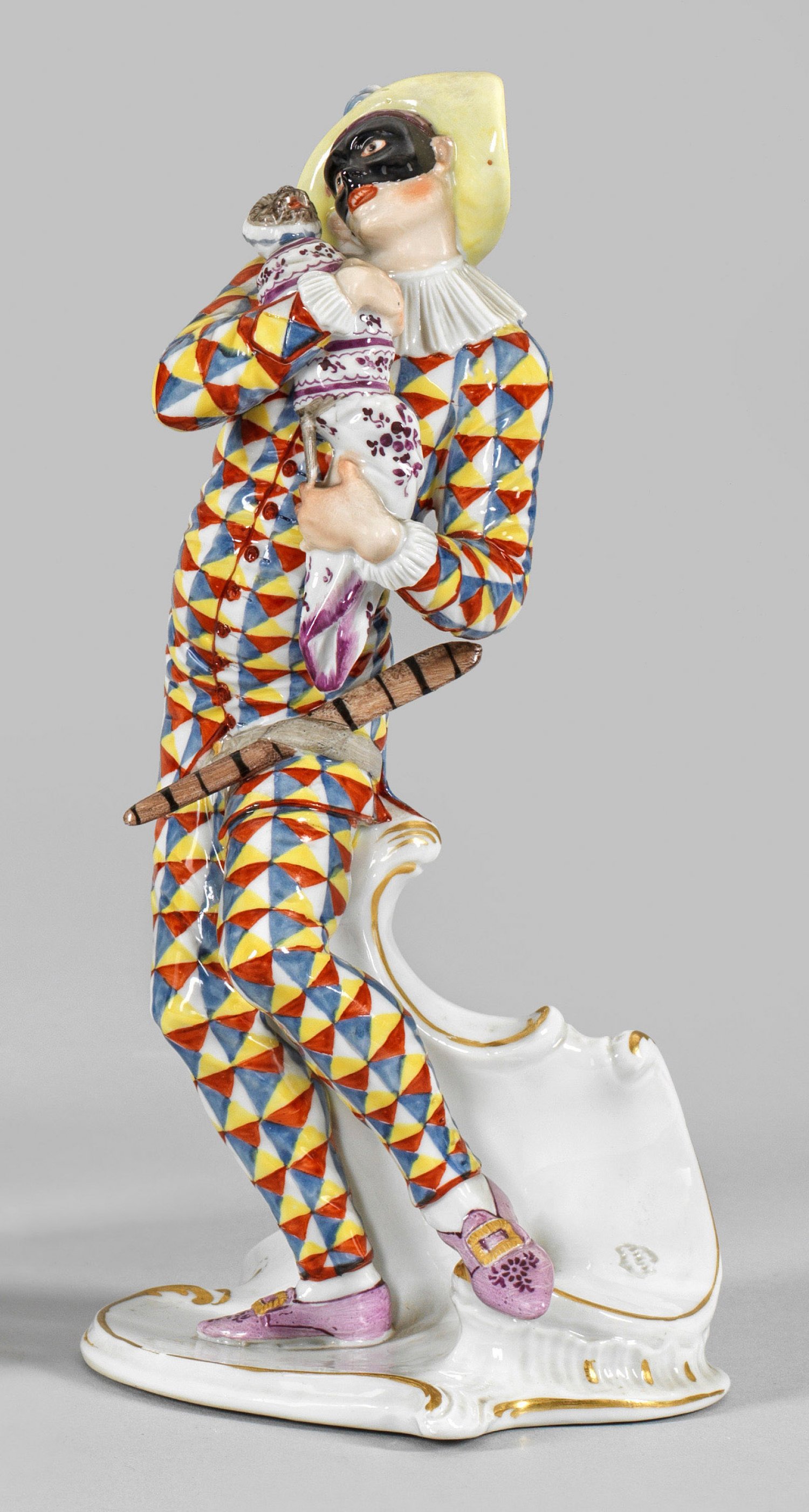 Auf Rocaillesockel mit aufsteigender Stützvolute stehender Komödiant in kariert gemustertem Kostüm und weißer Halskrause, gelbem Hut und schwarzer Maske, in den Armen ein Affenbaby tragend. Polychrome Malerei mit Goldstaffage. Entw. Franz Anton Bustelli, um 1760. Manufakturmarke. H. 19 cm.