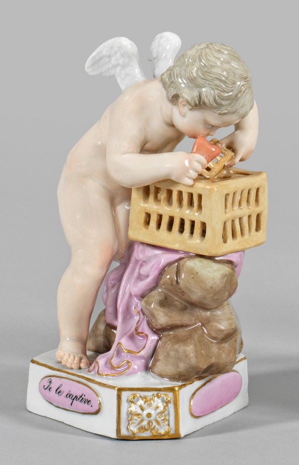 Dreiseitiger Sockel mit Rosetten, bez. "Je le captive". Auf einem Felsblock kniende Amorette, ein Herz in einen Käfig sperrend. Polychrome Malerei mit Goldkonturierung. Entw. Michel Victor Acier. Modell-Nr. F 15. Unw. rest.; Schwertermarke. H. 12 cm.