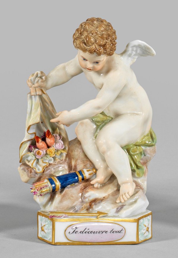 Dreiseitiger Sockel mit Rosetten, bez. "Je decouvre tout". Auf einem Fels sitzende Amorette, auf zwei Flammenherzen deutend. Zu den Füßen ein goldener Pfeil und gefüllter Köcher. Polychrome Malerei mit Goldstaffage. Entw. Michel Victor Acier. Rücks. Modell-Nr. 13. Brandriss. Schwertermarke. H. 13 cm.