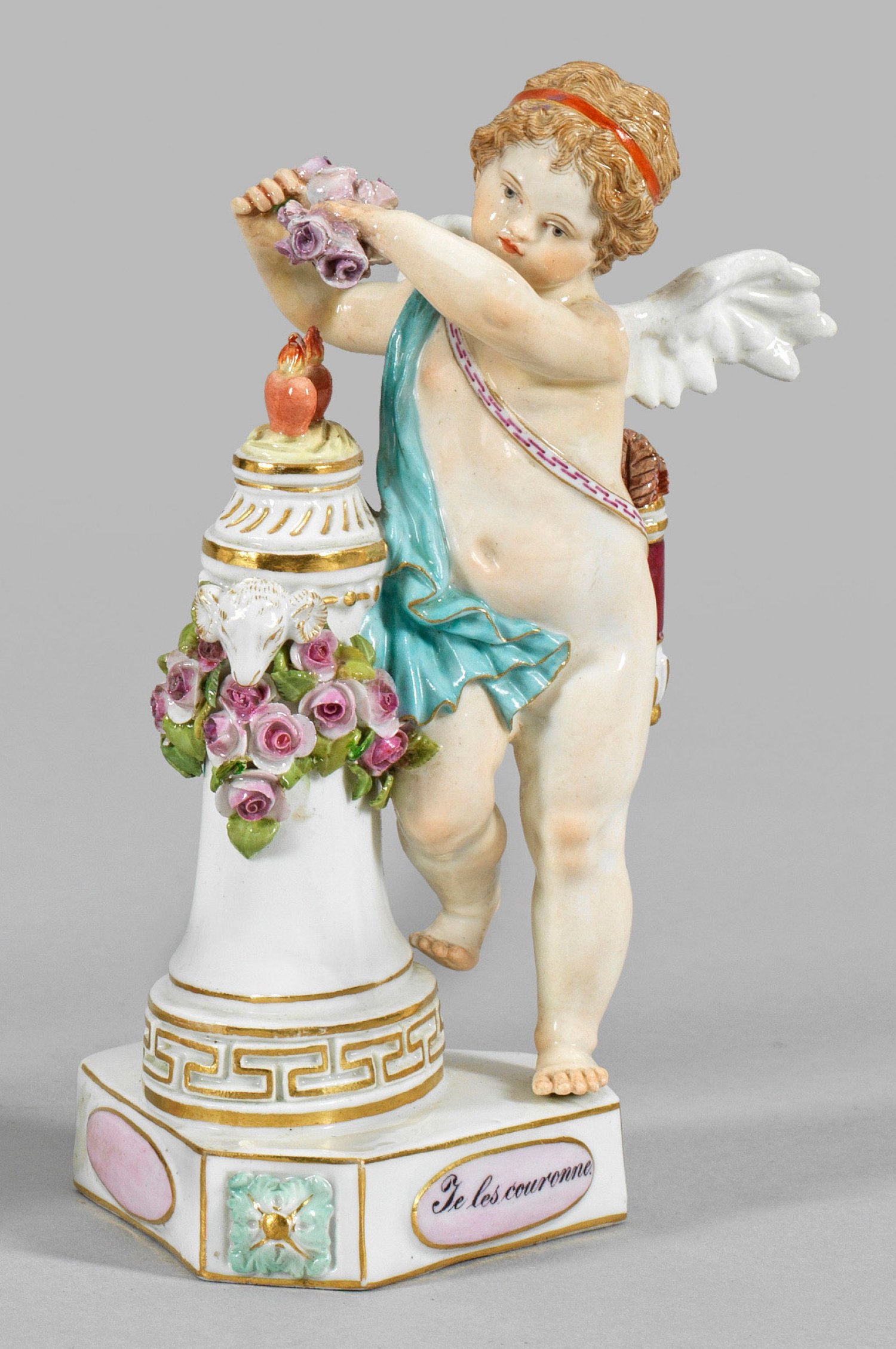Dreiseitiger Sockel mit Rosetten, bez. "Je les couronne". An einer Säule mit feinplastischer Rosengirlande und zwei flammenden Herzen stehende Amorette, in den Händen Blumen haltend. Polychrome Malerei mit Goldkonturierung. Entw. Michel Victor Acier. Modell-Nr. F 3. Minim. best.; Rest.; Schwertermarke. H. 14 cm.