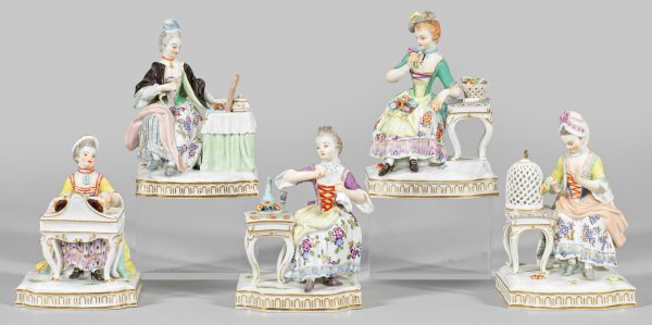 A complete series of allegorical figure groups of the "Five senses" representing the sense of hearing, taste, sight, feeling. Minor chipped. Partly insignificantly restored. Crossed swords mark.