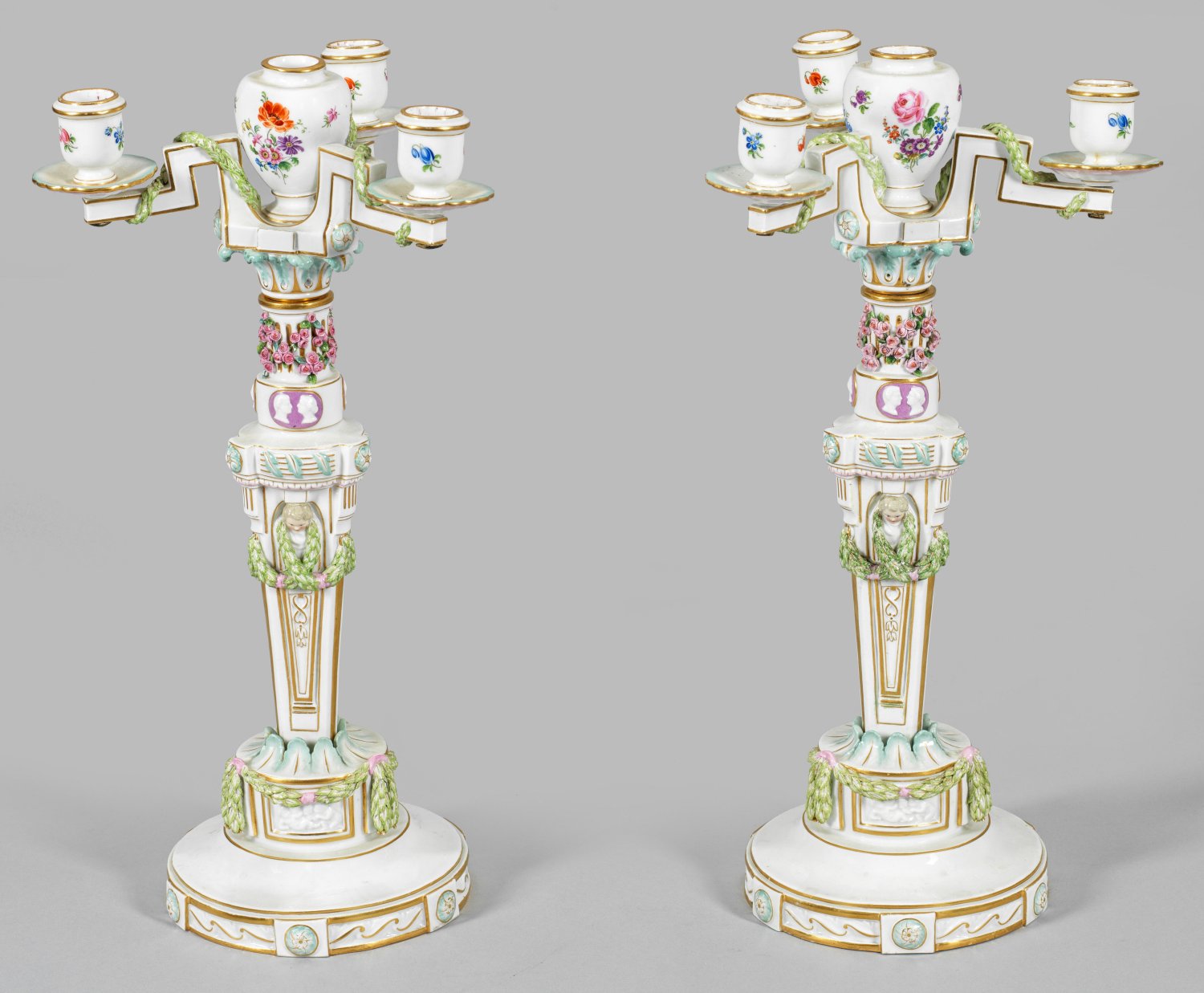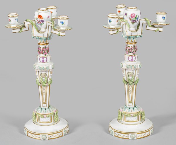 1- bzw. 3-flg.; Auf mehrfach gegliedertem Rundsockel mit Puttenmotiven konisch aufsteigender, dreiseitig profilgerahmter Schaft. Oberhalb, über Rundbasis mit ovalen Porträtmedaillons, ansetzende Tülle, umzogen von plastischen Rosengirlanden. Abnehmbare, dreiflammige Leuchterkrone aus gekanteten Leuchterarmen "à la grecque" mit vasenförmigen Tüllen, mittig Bekrönung in Form einer Balustervase. Reicher, reliefplastischer Dekor im Louis-XVI-Stil aus Lorbeerfestons, Rosetten und Akanthusblättern sowie Wellenband. Oberhalb farbenprächtige Blumengebinde und gestreute Blumen. Polychrome Malerei mit Goldstaffage. Entw. wohl Michel Victor Acier. Modell-Nr. 61. Minim. best.; Schwertermarke. H. 43 cm.