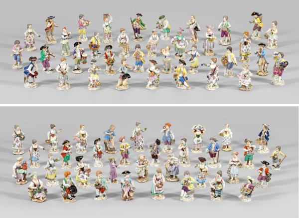 Auf rocaillereliefiertem Sockel sitzende und stehende Mädchen und Knaben als Gärtner, Winzer und Hirten in sommerlicher, teilw. mit Spitzenputz versehener Rokoko-Kleidung mit unterschiedlichen, beigefügten Attributen, u.a. mit Blumen-, Trauben- und Gemüsekorb, Rute, Werkzeugen und Weinkiepen bzw. musizierend oder begleitet von verschiedenen Tieren. Polychrome Malerei mit Goldstaffage. Entw. Johann Joachim Kaendler und Michel Victor Acier, um 1740 bzw. 1778/79. Teilw. unw. rest./best.; Schwertermarke. H. 10 cm - 14 cm.