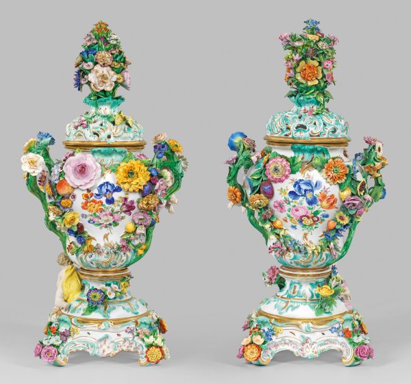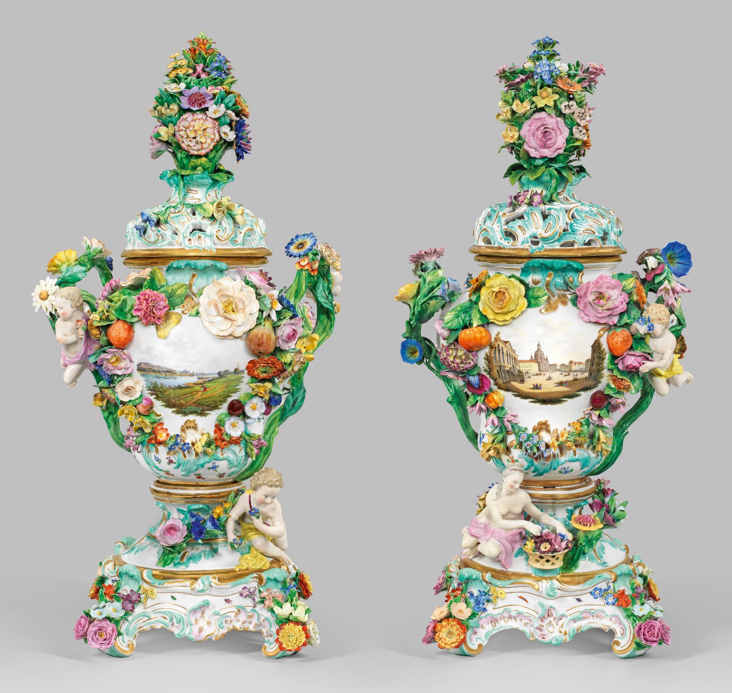 auf quadratischem, von eingerollten Volutenfüßen getragenem Sockel. Über getrepptem, rocaillereliefiertem Rundfuß balusterförmiger, stark vorwölbender Vasenkorpus mit gerundeter Schulter und profiliertem Rand. Gehöhter, von Rocaillereliefs umzogener, durchbrochen gearbeiteter Deckel, in reliefplastische Blätter übergehend, als Basis für ein prächtiges Blumenbukett aus verschiedenen, äußerst feinplastisch modellierten, geöffneten Blüten. Seitlich reliefplastisch aufsteigende Blumenranken als Handhaben. Feinplastisch modellierter, aufgelegter Dekor mit üppigen Festonen aus sommerlichen Blüten und Früchten. Unterhalb sitzende Flora bzw. Amorette mit gefülltem Blumenkorb und Girlande. Oberhalb jeweils schwebende Amorette. Beidseitig der Wandung zwischen farbigem Streublumendekor angelegte farbenfrohe Blumenarrangements sowie eine Ansicht des Dresdner Neumarktes mit Blick auf die Frauenkirche bzw. der Darstellung des Blickes über die Elbe auf Schloss Pillnitz. Feine polychrome Malerei mit reicher Goldstaffage. Entw. Johann Joachim Kaendler. Minim. best.; Rest.; Modell-Nr. 2745. Schwertermarke. Meissen, 19. Jh. Ges.-H. ca. 65 cm. Vasen-H. 37 cm.