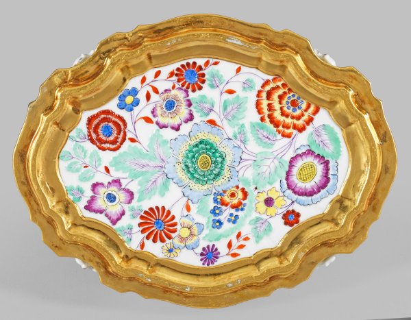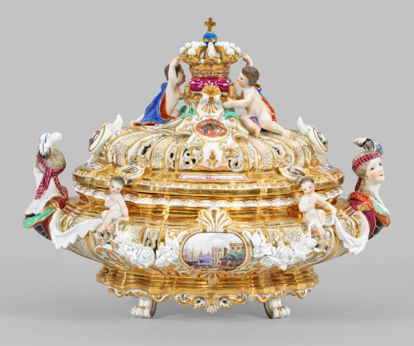 A small splendid decorated porcelain tureen, originally for Maria Josepha of Austria, wife of king August III of Poland. Minor restored. Crossed swords mark.